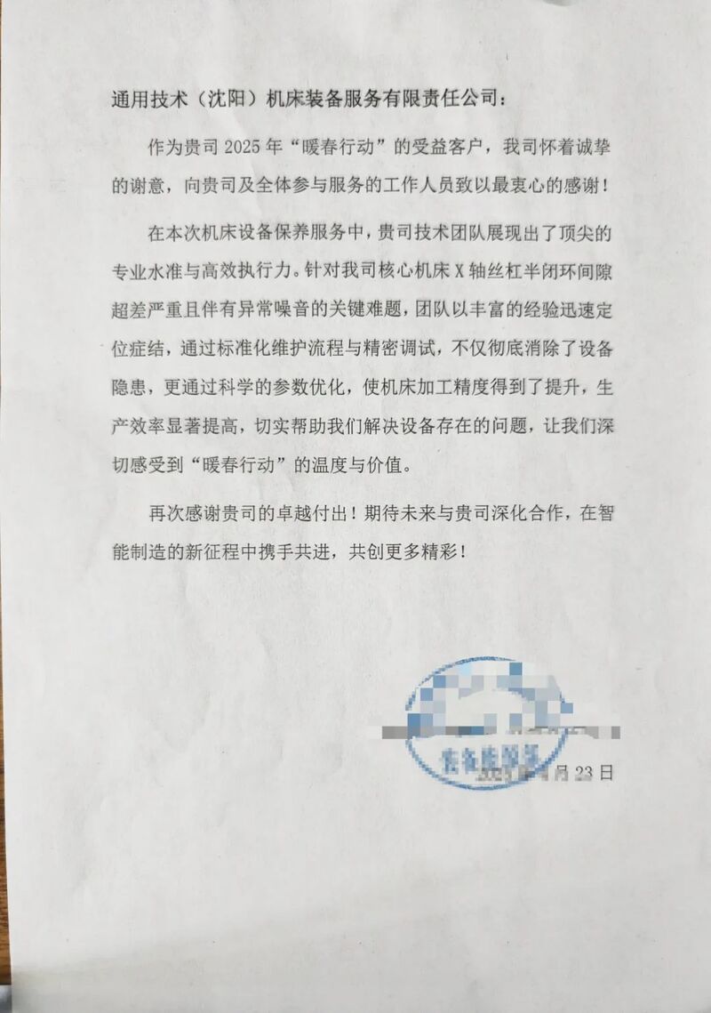 装备服务公司圆满完成客户核心机床标准化保养服务,并针对设备现存技术难题,凭借精湛技术成功攻克,获得客户表扬。客户特别指出,在此次机床设备保养服务中,深刻感受到服务团队展现出的专业素养、高效执行力和精细化服务水准,为保障企业生产连续性提供强有力支撑。